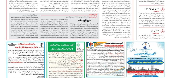 آگهی تجدید مناقصه عمومی برای اجرای عملیات آرماتور بندی، قالب بندی، نصب بولت و بتن ریزی و غیره در سازه های CLEAN COOLING TOWER ,Contaminated&CLEAN WATER BASIN به همراه تجهیز و برچیدن کارگاه به صورت دستمزدی در پروژه احیا مستقیم اقلید شرکت ساختمانی و نصب صنایع ومعادن پارس (پامیکو) مناقصه عمومی برای اجرای عملیات معماری […]